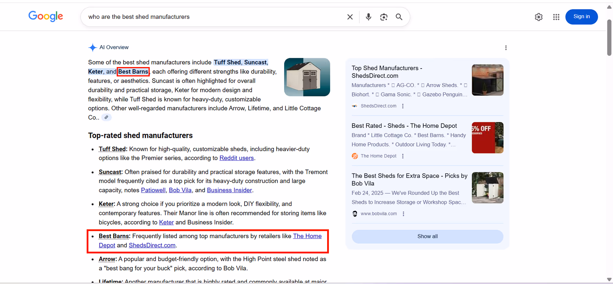 Google’s AI algorithm also liked what we did, shown here in this example of the same search we put into ChatGPT for “Who are the best shed manufacturers”. Best Barns is not only featured, but the results direct the user where to buy the products at Best Barns’ retailers.